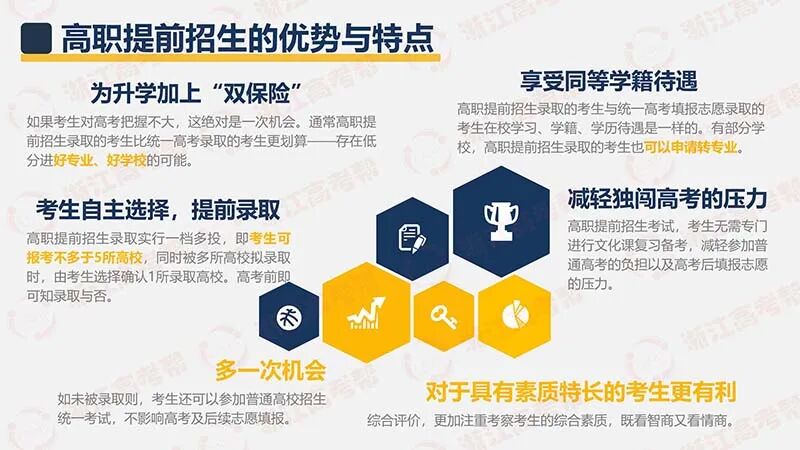 高职提前招生是浙江省新高考综合改革后四种主要的选拔录取模式之一(其他三种模式是单独考试招生、三位一体招生和统一考试招生),其最核心的意义在于实施综合评价,全方位考察学生。